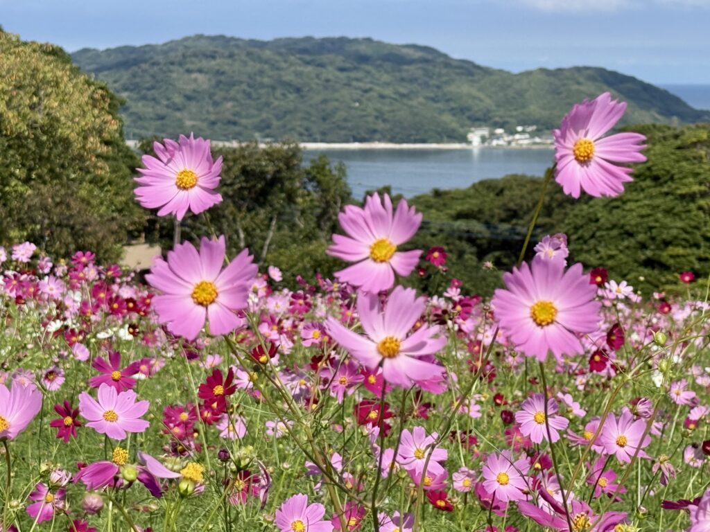 早咲きのコスモスが満開で、志賀島も近くに見える景観は壮観でした👍
