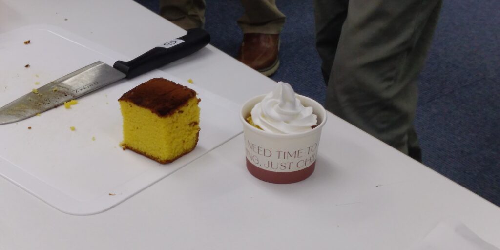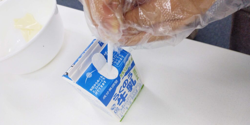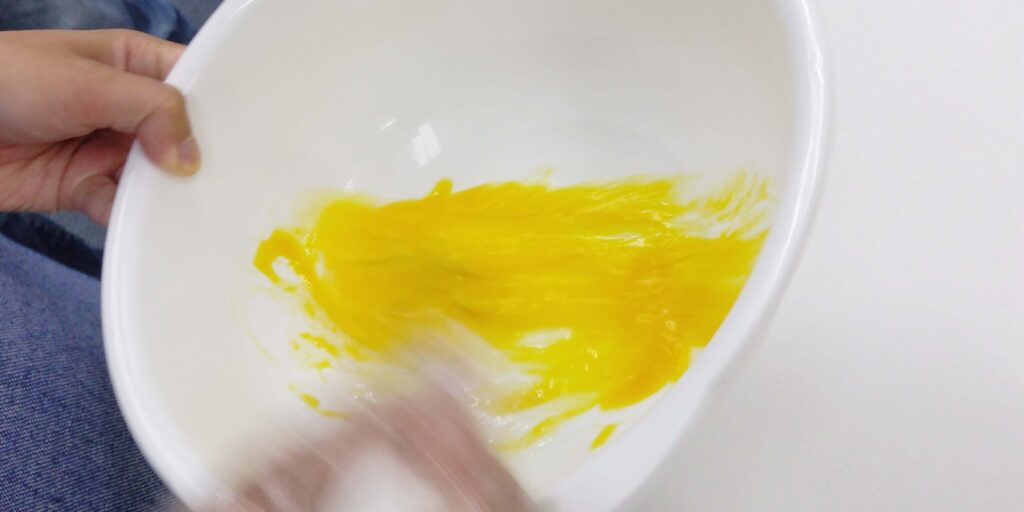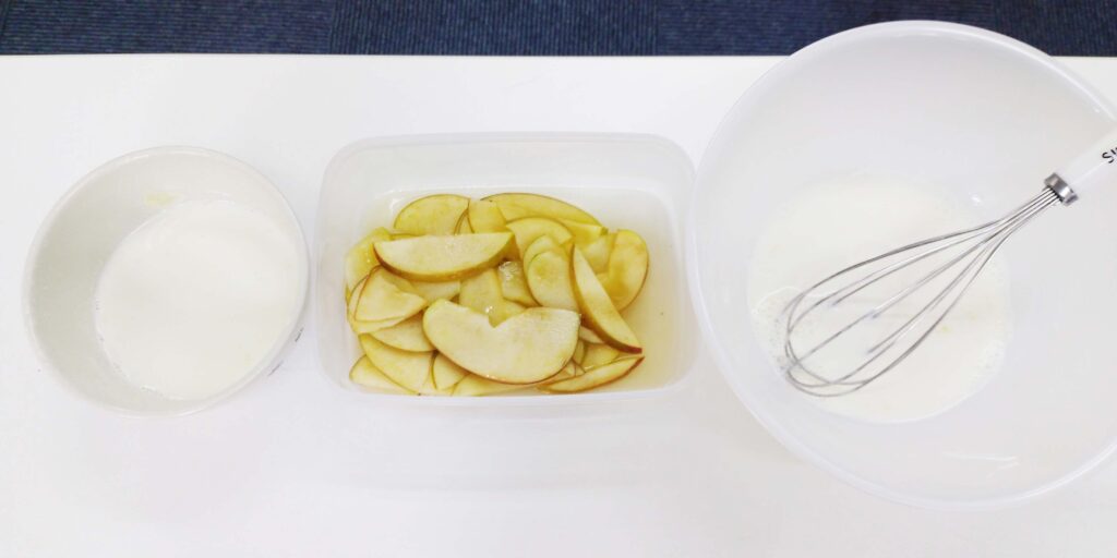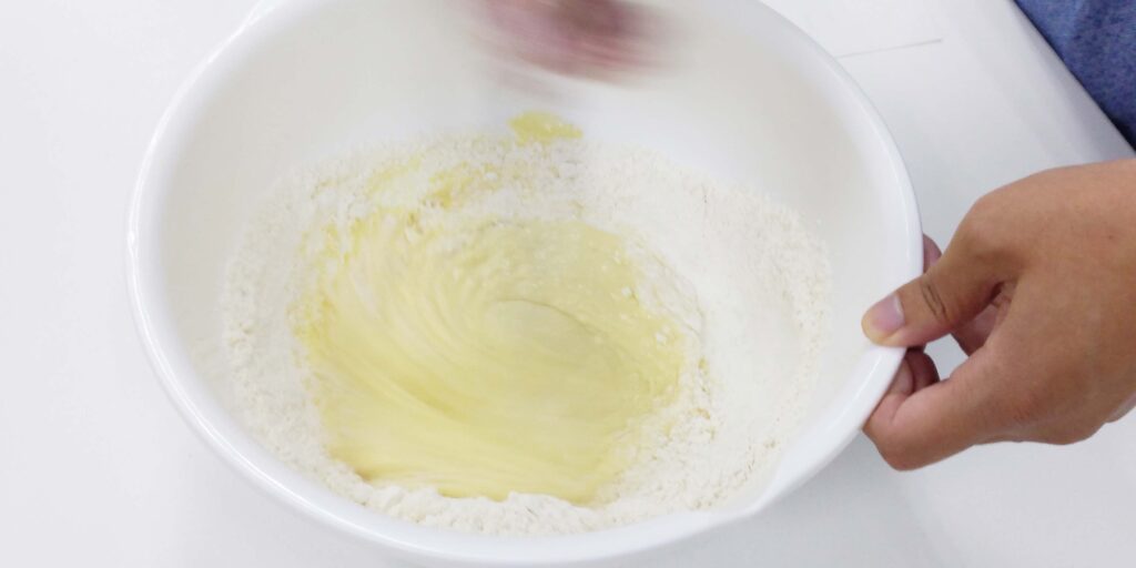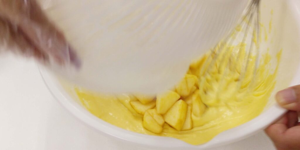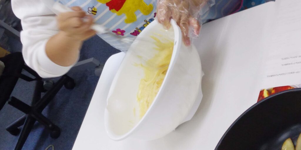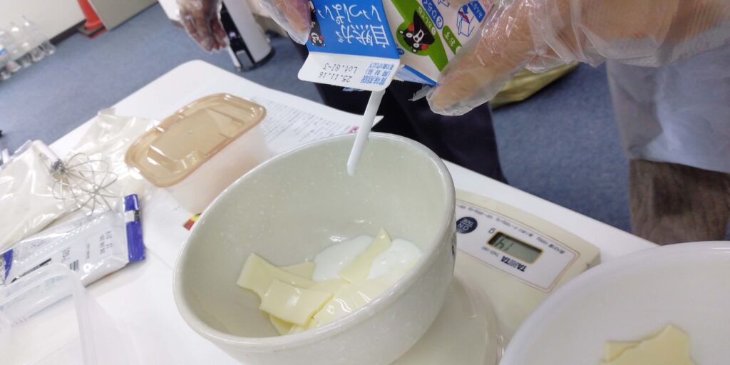 そこに卵、ホットケーキミックス粉、先ほどの牛乳たちを加えてかき混ぜます。