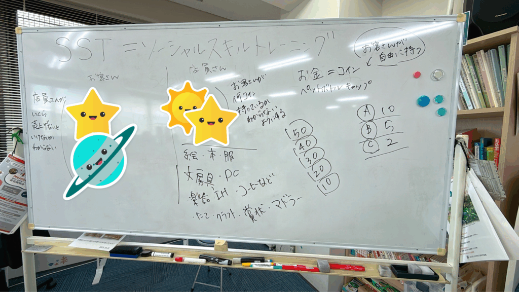 SST…ソーシャルスキルトレーニングの略で、普段の生活での振る舞いを想定してどうすればよいかを実践するトレーニングです。