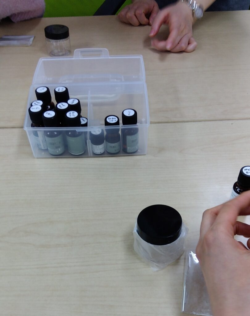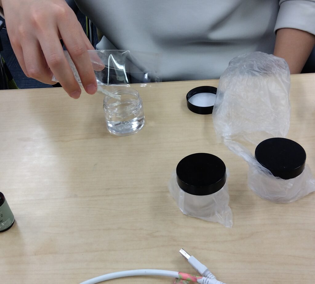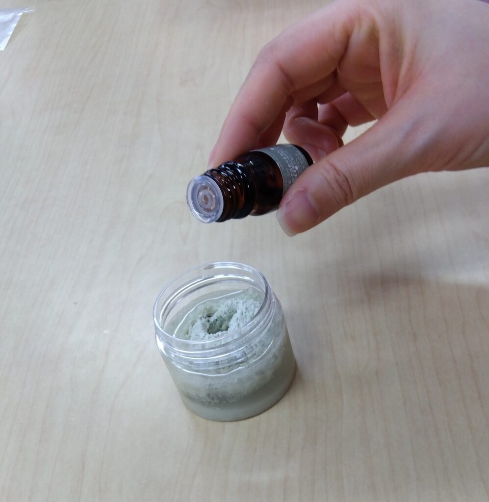 専用の容器に精製水とクレイ(モンモリロナイト)を入れ、さらに好みの精油を数滴加えます。