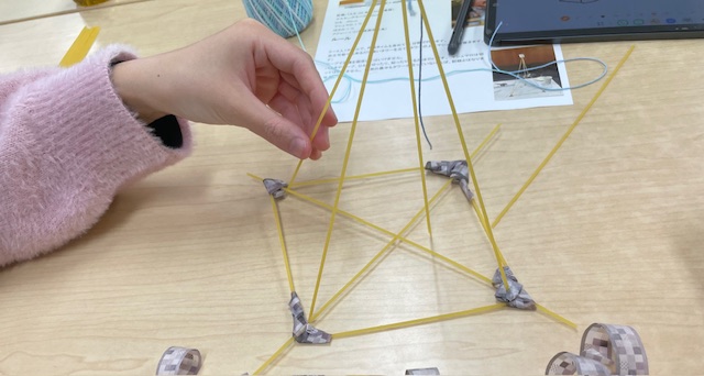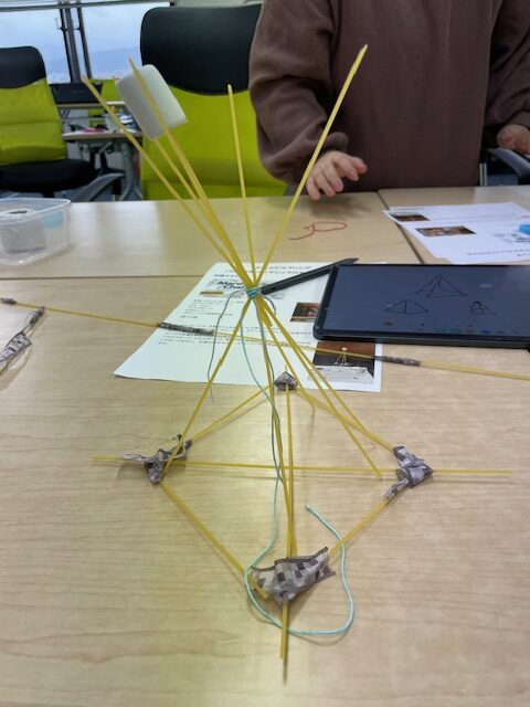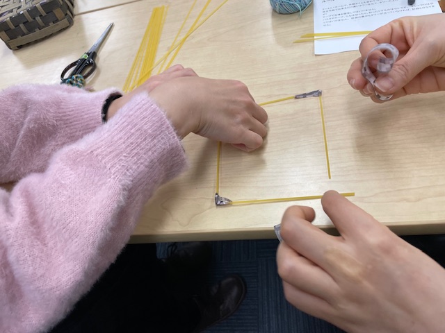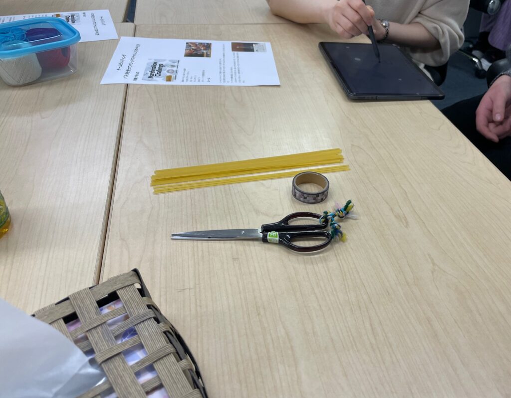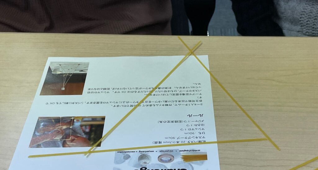 3~4人で1組、20分の間にパスタでできるだけ高いタワーを立てます。