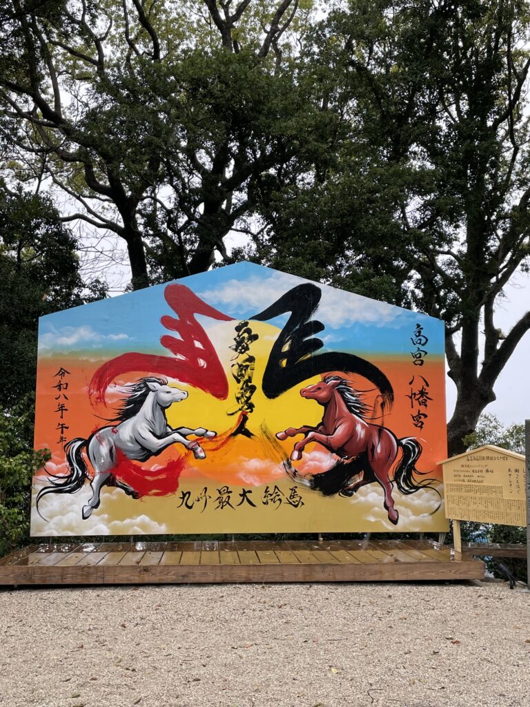 階段を登って「手水舎」で手を清めて横を見ると、「九州最大の大絵馬」にびっくり😲😲😲