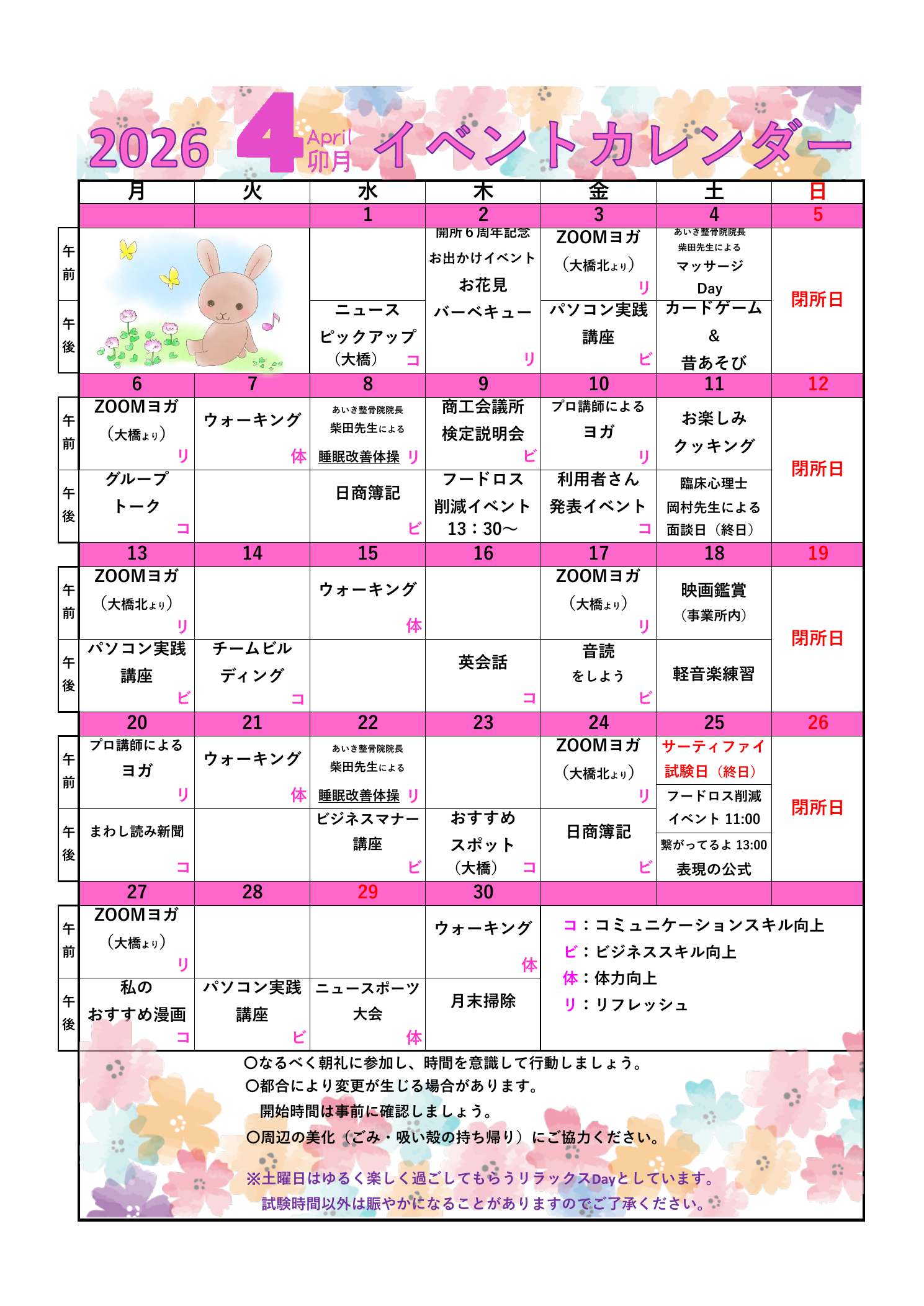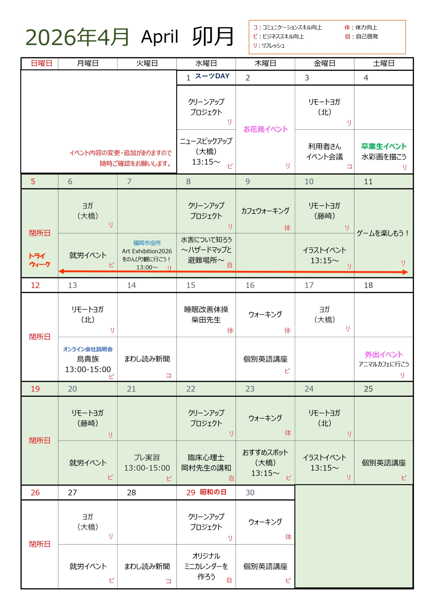 4月のイベントカレンダーとなります。 ご来所の際のご参考にされてくださいませ。 2026_4月イベン