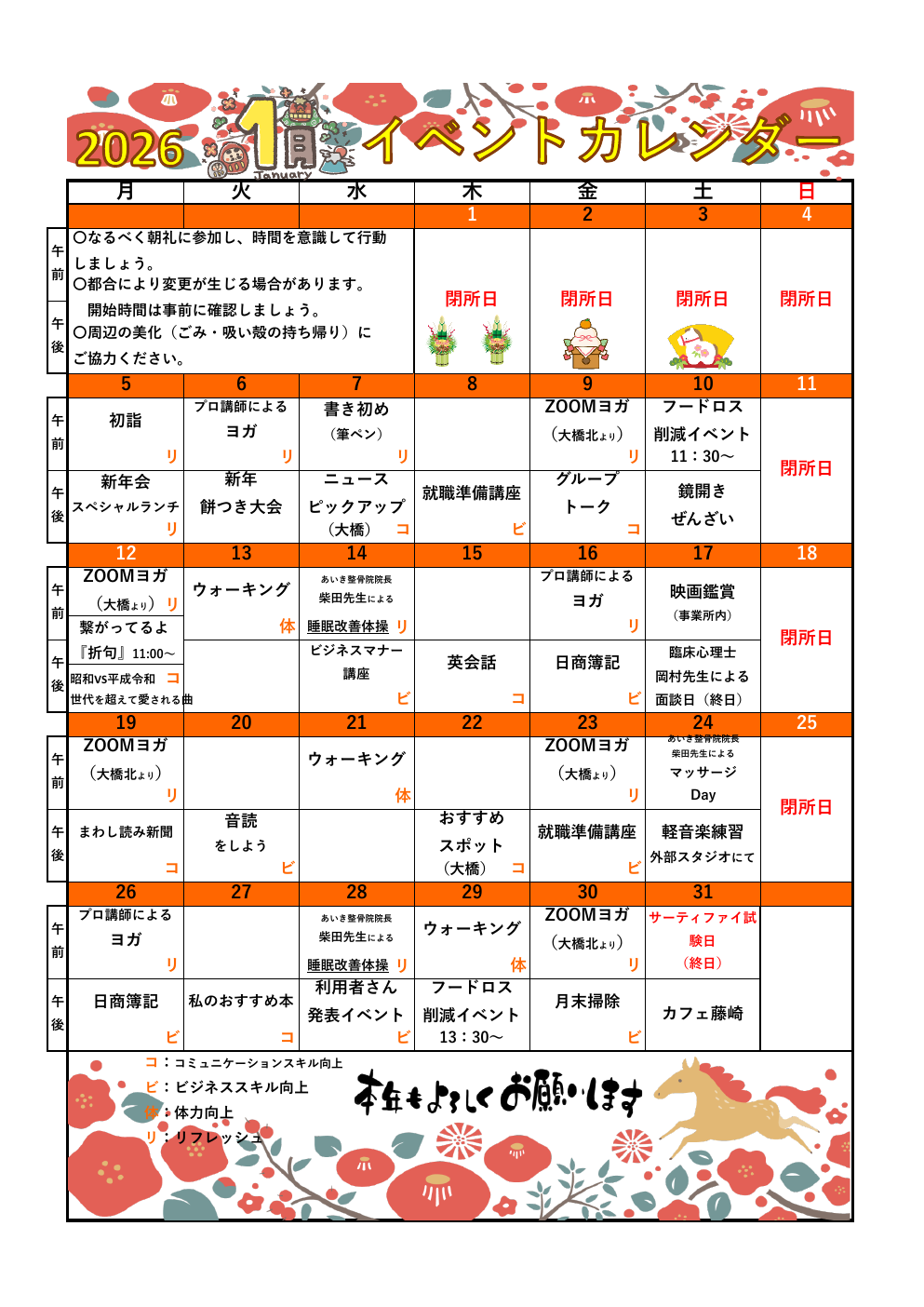 来年の1月のイベントカレンダーをお送りします(^^) 来年は午年です。 新年イベントなども予定してお