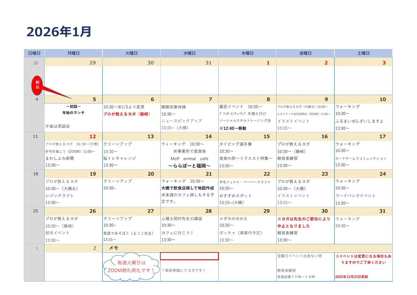 こんにちは!フィン大橋北です(*^_^*) 2026年1月のイベントカレンダーです。 盛りだくさんの