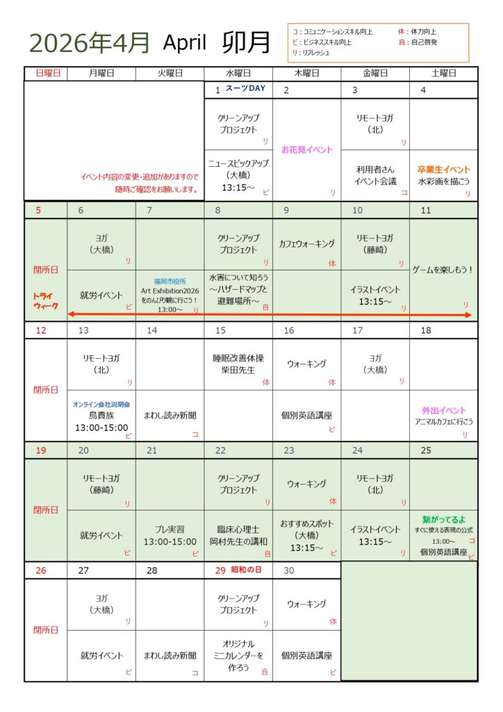 こんにちは、4月のイベントカレンダーの修正版をお知らせします!